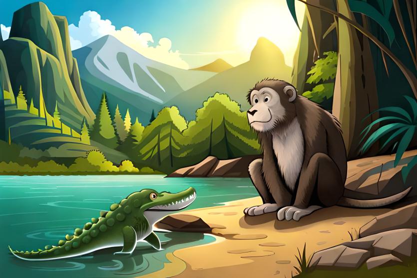 Once, a crocodile invited a monkey from a tree to ride on his back. The monkey, in his foolishness, jumped down and found himself on the crocodile’s back in the river.